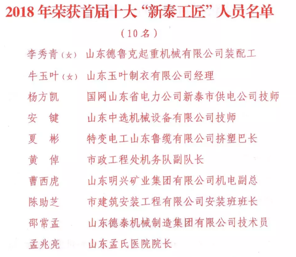 山东德鲁克起重机有限公司装配工李秀青荣获首届“新泰工匠”称号